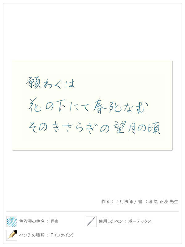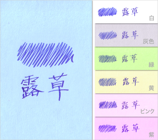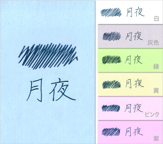 色彩雫シリーズにブルー系を多く揃えたのもこだわりのポイントです。澄んだ青空を思わせる鮮やかな「紺碧」、瑞々しい初夏の水滴のような「露草」、日本人に馴染み深い青色である「朝顔」や「紫陽花」、さらに水面に浮かぶ月のイメージの「月夜」まで。どんな場面でも安心して使える青系のインキは、その選び方であなたの個性をさりげなく主張できます。