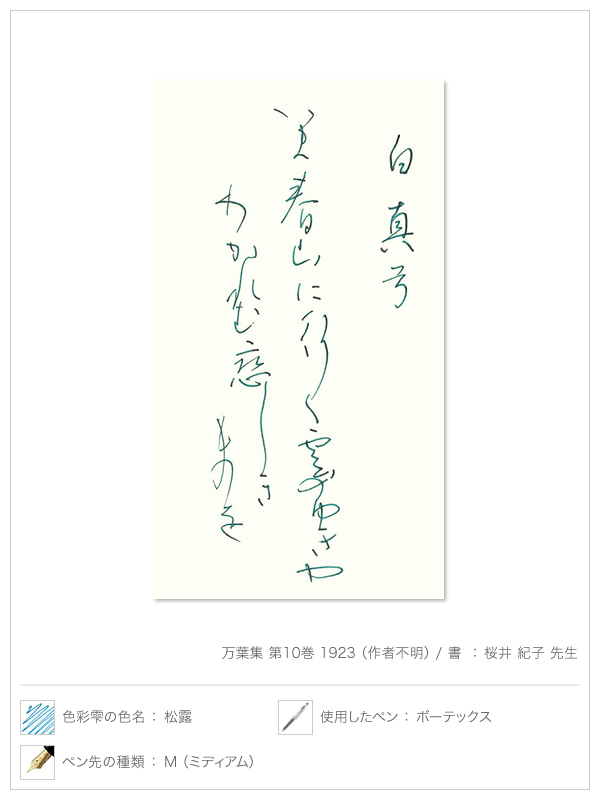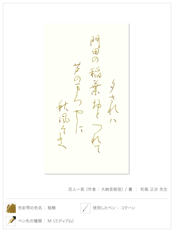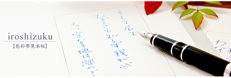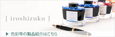 初めての万年筆を手に入れ、万年筆に親しみ、"書く時間"そのものが楽しくなってきた方へ、次にお勧めしたいのは "インキの色で遊ぶこと" 。公式な書面に使用するインキは黒やブルーブラックが定番ですが、プライベートな用途では好きな色を自由に使ってみたいものです。パイロットの万年筆用インキ iroshizuku-色彩雫(いろしずく)シリーズには独特の雰囲気や味わいをもったさまざまな色があります。万年筆のペン先を通してそのよさを実感してください。