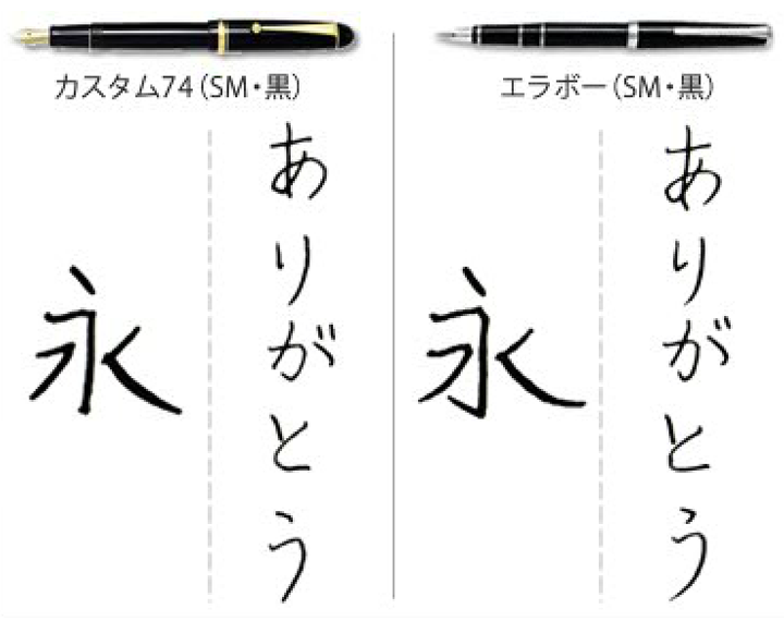 ボールペンの硬い筆致に慣れた世代に向けて開発されたカスタム74よりも、エラボーの方がより毛筆の筆致に近い「はね」「はらい」などを弱い筆圧で表現できます。